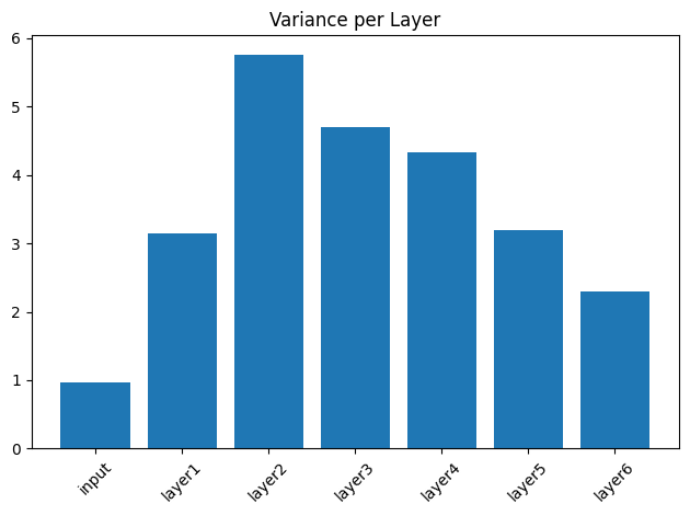 # run the training loop for 50 epochs and monitor the variance at each point in the network
